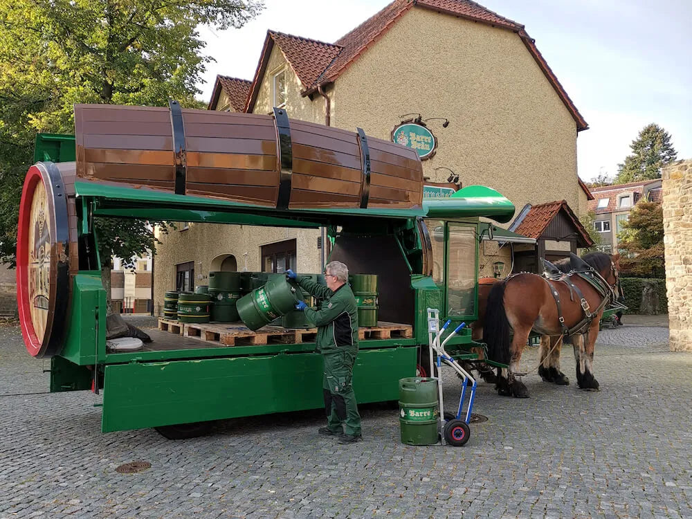 Pferd und Kutscher trugen die Verantwortung dafür, dass das Bier der Brauerei Barre den Weg zum Kunden fand. Aus Respekt vor den Tieren und unserer Tradition, ist Barre eine der letzten Brauereien in Deutschland, bei denen bis heute wöchentlich ein Pferdegespann in der Bierauslieferung im Einsatz ist. Wenn unsere zwei Kaltblüter Gustav und Alfred also nicht gerade die einfahrenden Gäste der Stadt Lübbecke von ihrem Paddock aus begrüßen oder es sich auf der Weide hinter dem Stall gemütlich machen, fahren sie in Lübbecke Bier aus. So bekommen die Gastronomen unserer Heimatstadt jeden Freitag ganz besonderen Besuch. Bezahlt werden diese zwei Logistikmitarbeiter übrigens bevorzugt mit frischen Möhren oder anderen Köstlichkeiten. Ein verdienter Lohn – auch wenn Sie nur an einem einzigen Tag in der Woche zur Arbeit kommen müssen.